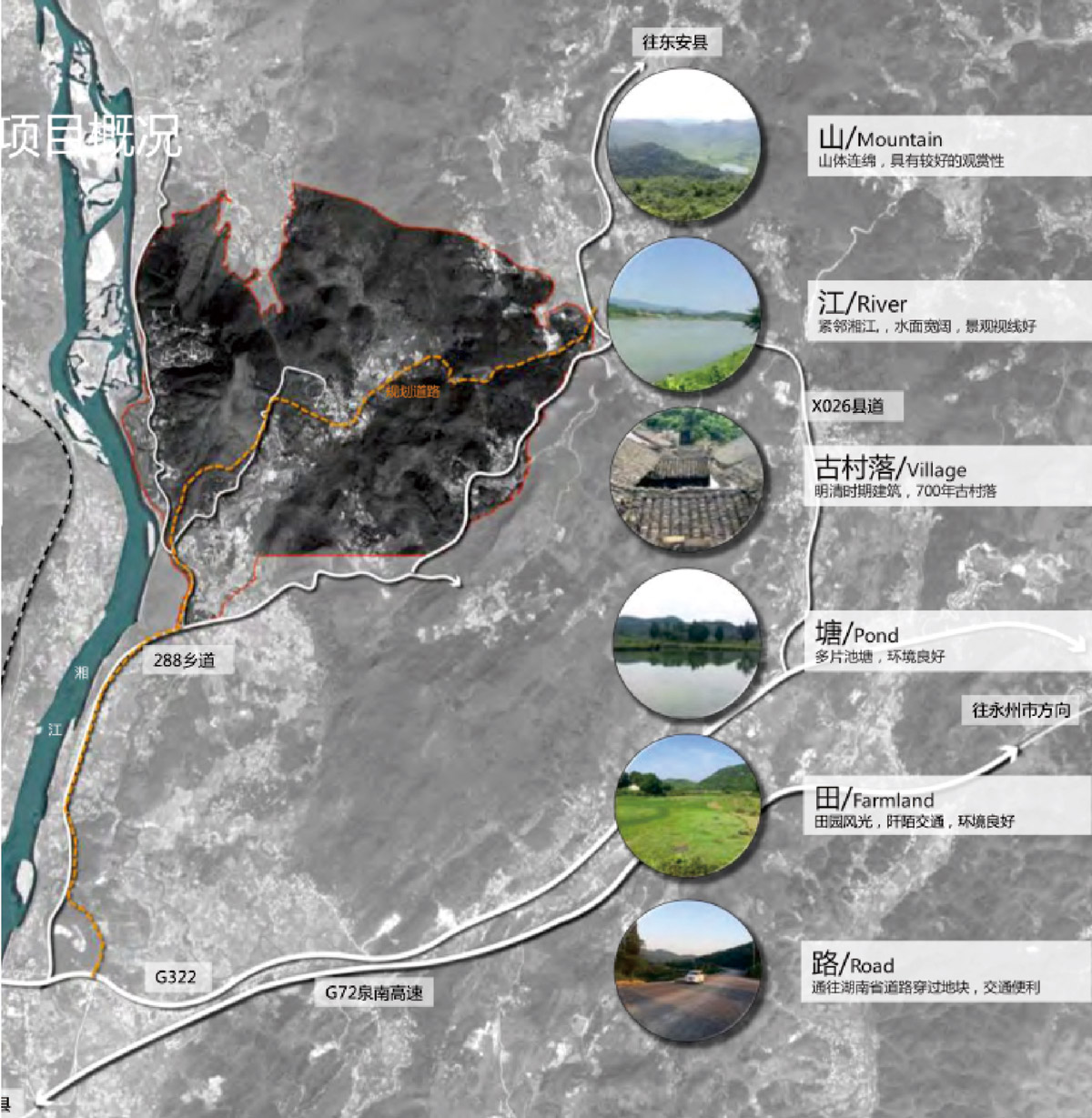 ? ? ?? 項目規(guī)劃總面積約8.3平方公里(約12415畝),主要由林田地、山丘與湘江水面組成,是以規(guī)劃區(qū)風山體佇立,形成自然風鵬金所面貌景觀,并有少量住宅用地、農(nóng)田用地和交通道路用地,自然生態(tài)環(huán)境較好,用地條件較好。
